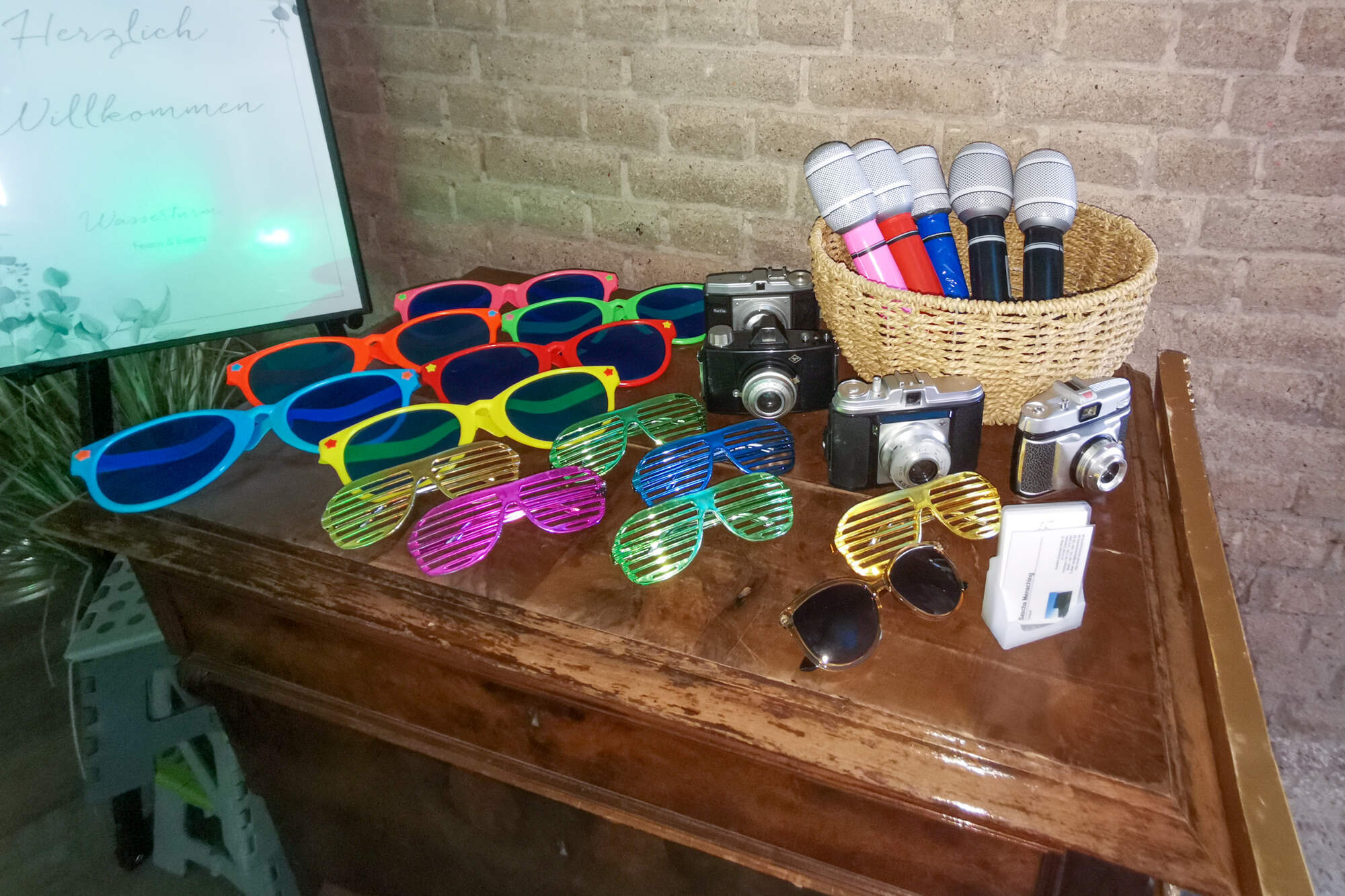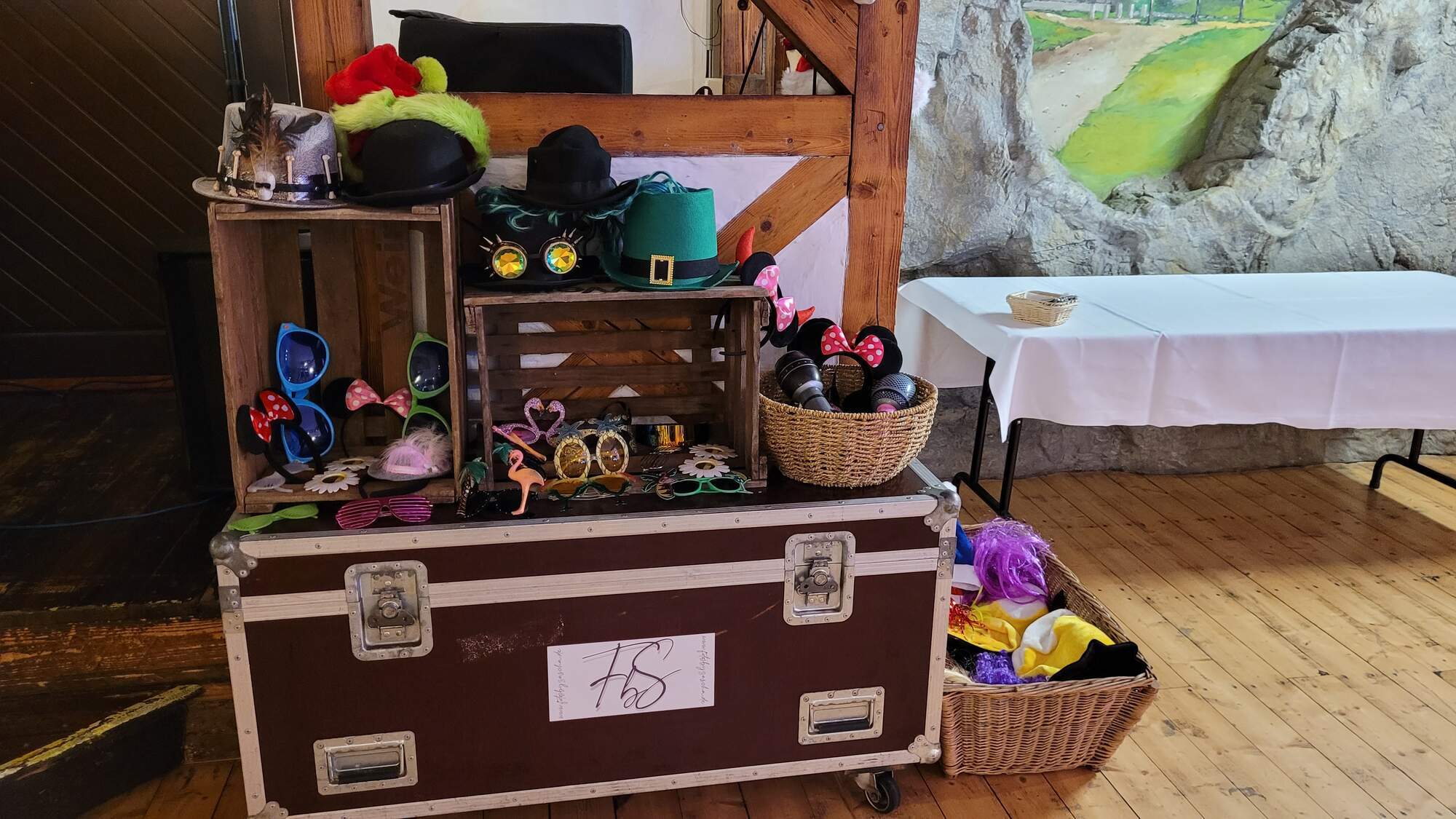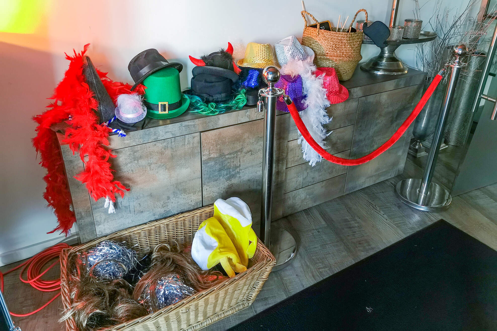 • Riesiges Requisiten-Paket: Von edel bis flippig – meine prall gefüllten Körbe bieten eine riesige Auswahl an Hüten, Brillen und Boas für jeden Gast.