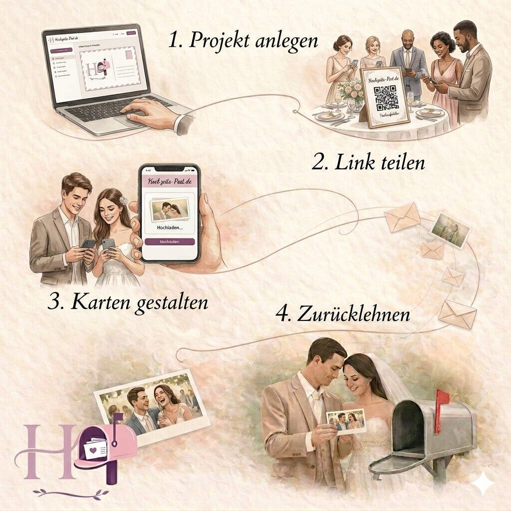 Die Hochzeitsgäste laden noch während der Feier ihre schönsten Bilder und persönlichen Grüße einfach online hoch. Daraus gestalten wir hochwertige Erinnerungskarten, die professionell gedruckt und ans Brautpaar verschickt werden.